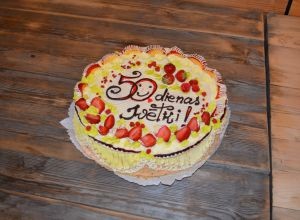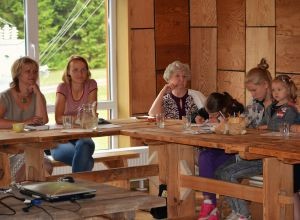 A monumental Sabbath Feast. Inara and Ugis brought a large number of special pancakes filled with venison killed by Ugis; Juris brought special cheese, made by his wife, filled with unusual herbs … something we would never quite be able to get elsewhere; Skaidrite made a large cake which Liene finished decorating before services; and from a strawberry farm owned by relatives of the Kikutes, there were 2 five gallon buckets of freshly picked strawberries. These strawberries were not like the ones “from the store” … fresh, sweet and very meaty! There was too much other food to describe … these were some of the more unique things which were brought.